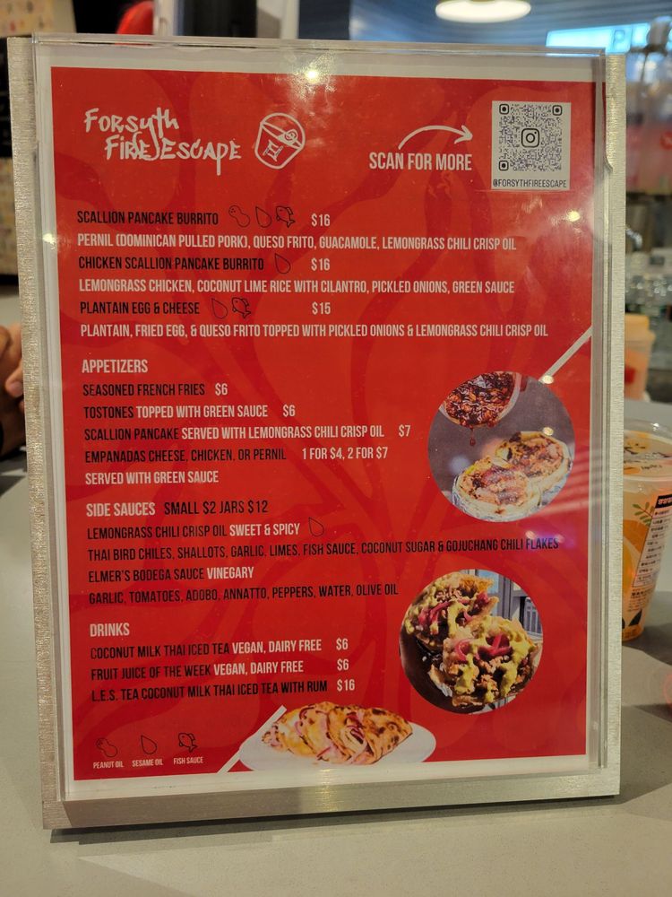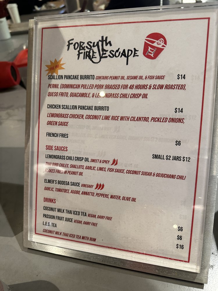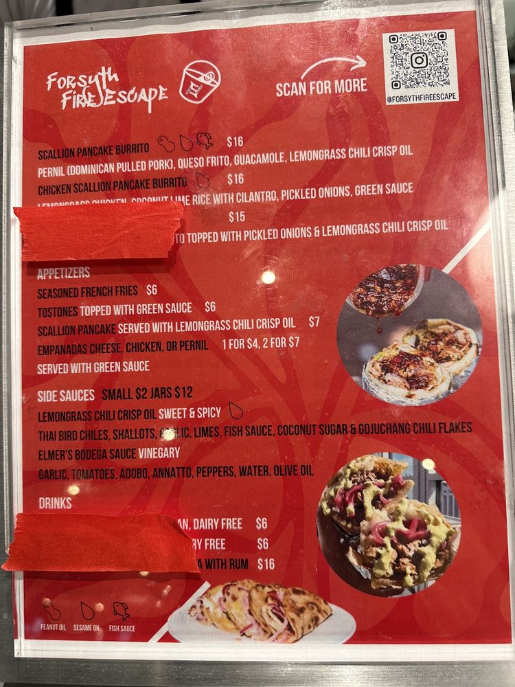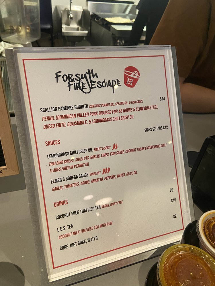 “ Getting to Olly Olly Market is quite a chore if you are lucky you can get the M23 Select Bus Service, the M12 or a quick walk from Hudson Yards, but I think there is a interesting mix of vendors plus great events that gets to me to return. Forsyth Fire Escape is one such stall. Because it is a stall and not a full blown restaurantkitchen, I knew to level set my expectations. Things will come out slower because you have to a small number of people to work safely and efficiently in such a small space. I think Forsyth is worth a try because it does a good job in trying to blend delicacies together. The Dominican, Chinese and Thai influences are present in every bite but they are not too overwhelming. A fresh burrito is crispy and the cheese melds with the pork Pernil and the lemon grass chili crisp oil. Though I have to say that the bowl is becoming more of my favorite. It comes with a side of scallion pancakes so you dont feel like youre missing out. My favorite part is the service. When my order had to be changed because an ingredient was missing, they made sure to tell me of my options and gave me an empanada for the trouble. I got to try the chicken for the first time and I gained an appreciation for the hardworking team. I would definitely come back. ”